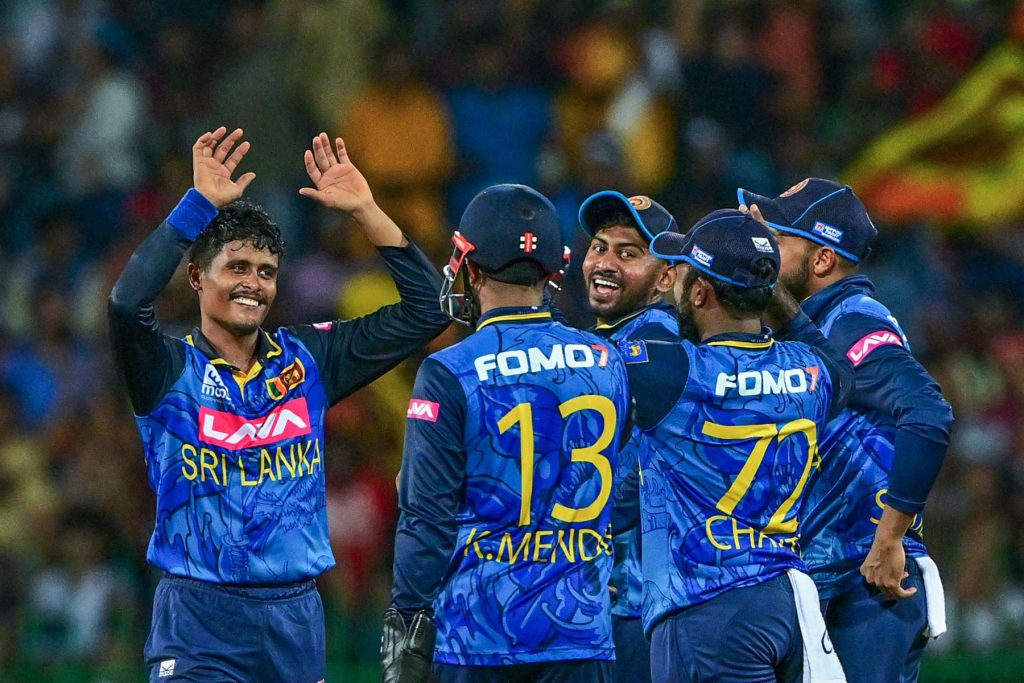 Sri Lanka’s Jeffrey Vandersay (L) celebrates with teammates after taking the wicket of India’s Shivam Dube during the third and final one-day international (ODI) cricket