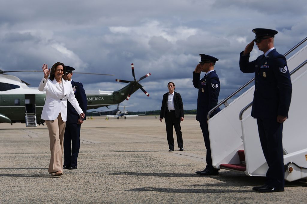 Democratic presidential nominee Vice President Kamala Harris, left, walks to board Air Force Two, Wednesday, August 7, 2024, at Joint Base Andrews, Md., en route
