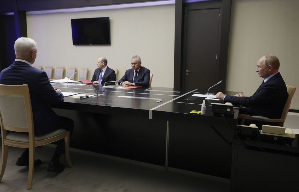 Russian President Vladimir Putin, right, chairs a meeting with Defense Minister Andrei Belousov, back to camera, Federal Security Service Chief Alexander Bortnikov, second left, and