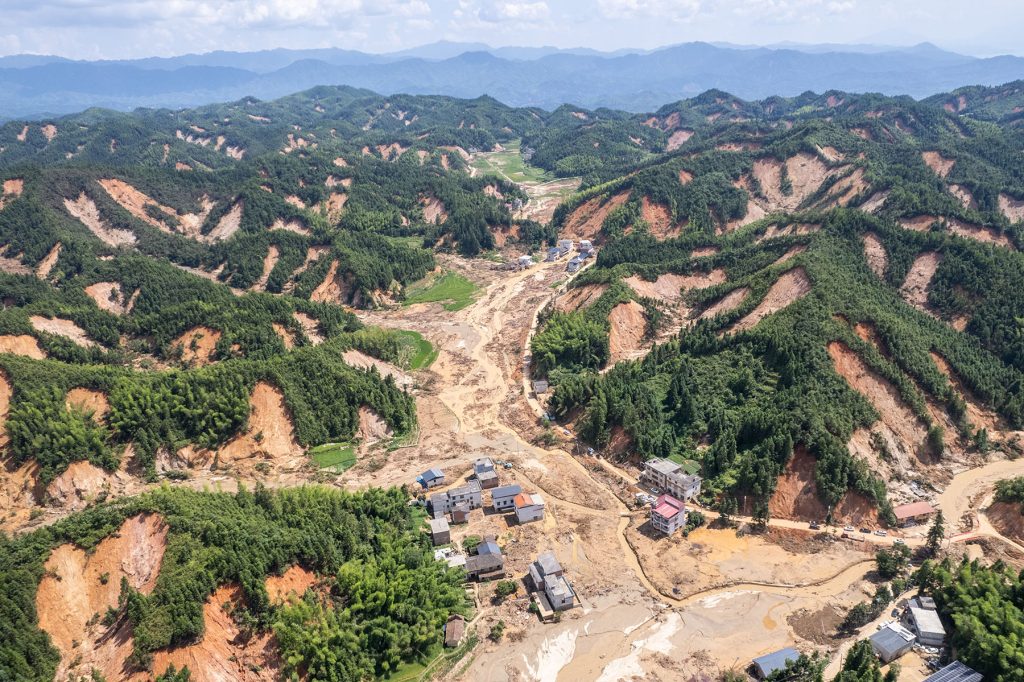 (240807) — CHANGSHA, Aug. 7, 2024 (Xinhua) — An aerial drone photo taken on Aug. 7, 2024 shows the disaster-affected areas in Zhoumensi Town of