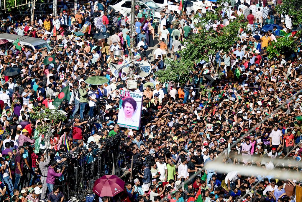 Bangladesh Nationalist Party (BNP) activists gather near a poster of BNP chairperson Khaleda Zia, during a rally in Dhaka on August 7, 2024. Bangladesh’s Muhammad