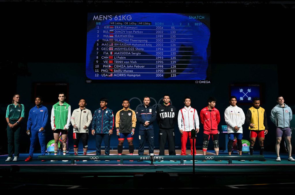 Competitors line up prior the men’s -61kg weightlifting event during the Paris 2024 Olympic Games at the South Paris Arena in Paris, on August 7,