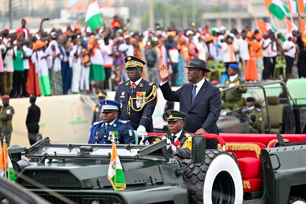 Ivorian President Alassane Ouattara (R) waves to supporters as he arrives during celebrations for the 64th anniversary of Ivory Coast’s independence in Grand-Bassam on August