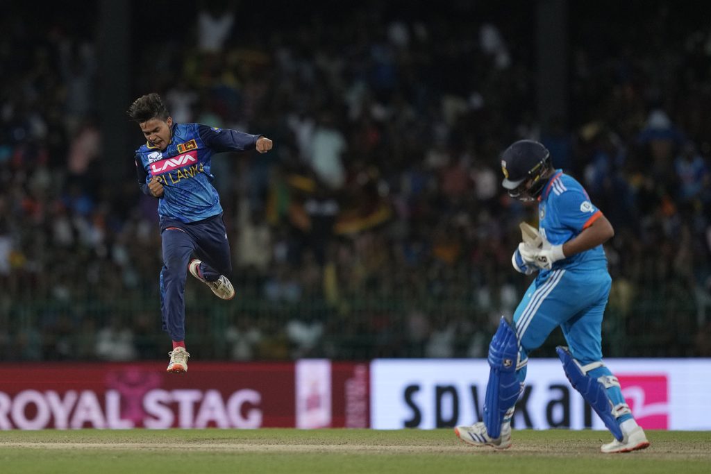 Sri Lanka’s Dunith Wellalage celebrates the wicket of India’s captain Rohit Sharma during the third ODI cricket match between Sri Lanka and India in Colombo,