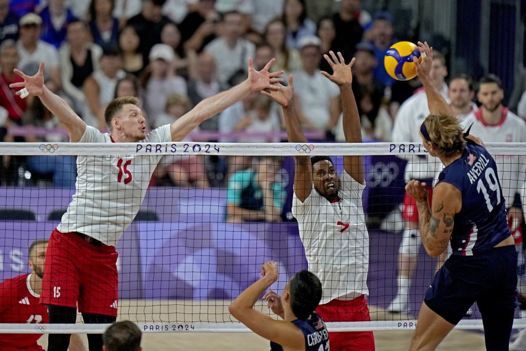 Jakub Kochanowski (15) and Wilfredo Leon Venero, center, both of Poland, try to block a volley by Taylor Averill, of the United States, during a