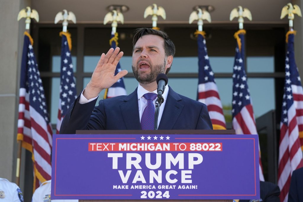 Republican vice presidential nominee Sen. JD Vance, R-Ohio, speaks at a campaign event at Shelby Township Police Department, Wednesday, Aug. 7, 2024, in Shelby Township,