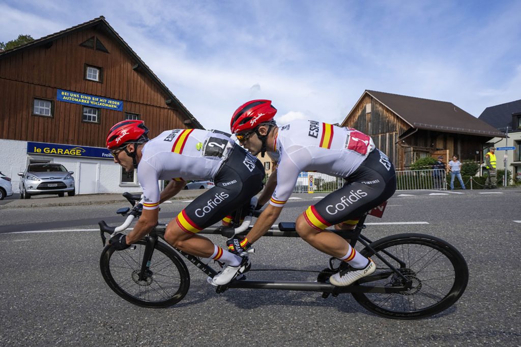 Imanol Arriorta Zorilla, right and visually impaired, and pilot Francisco Rus Garcia, left, of Spain compete in the compete in the Men B road race