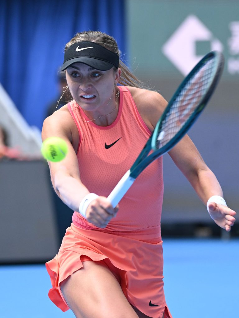(241005) — BEIJING, Oct. 5, 2024 (Xinhua) — Paula Badosa of Spain hits a return during the women’s singles semifinal match against Coco Gauff of