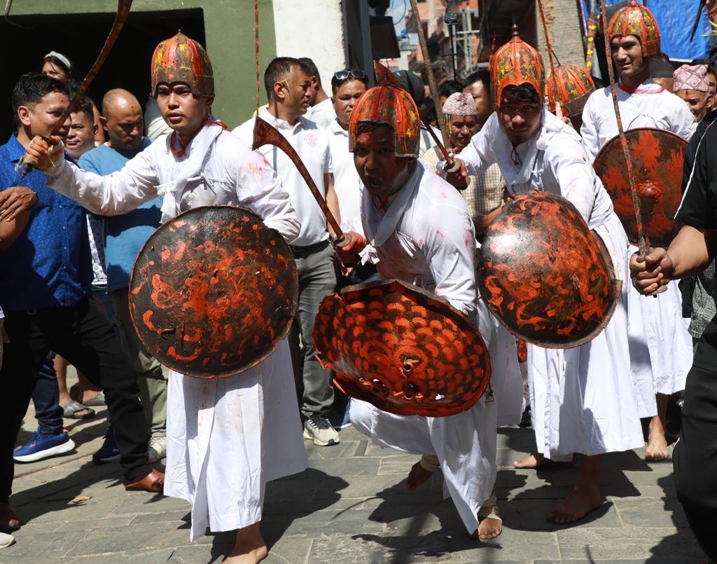 Guthiyars participating in the Bhuifasi Paleko Jatra (Kuvindo Cutting Jatra) performed on Papankusha Ekadashi day from Madhyapur Thimi Laiku Darbar exhibiting with spears. This Jatra