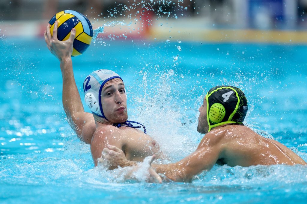 (241018) — ZAGREB, Oct. 18, 2024 (Xinhua) — Konstantin Kharkov (L) of HAVK Mladost vies against Giacomo Cannella of Pro Recco during the LEN men’s
