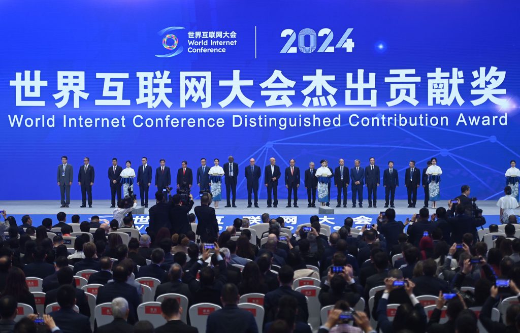 (241120) — TONGXIANG, Nov. 20, 2024 (Xinhua) — This photo shows a scene of a distinguished contribution award presenting ceremony held during the 2024 World