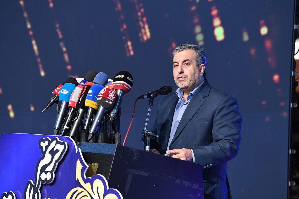 (241120) — RASHT, Nov. 20, 2024 (Xinhua) — Secretary of the media festival Mehdi Parsa speaks during the closing ceremony of the third national and