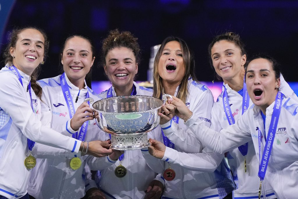 Italy’s tennis team celebrates on the podium after winning the Billie Jean King Cup final against Slovakia at the Martin Carpena Sports Hall in Malaga,