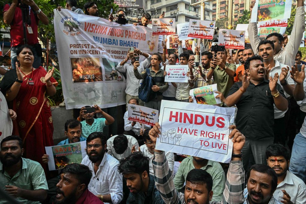 Indian Hindus teake part in a protest outside the Bangladesh High Commission in Mumbai on December 2, 2024, amid the unrest in Bangladesh after the