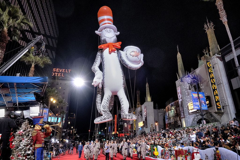 A giant Cat in the Hat balloon is marched down Hollywood Blvd. during the 92nd Hollywood Christmas Parade in the Hollywood section of Los Angeles