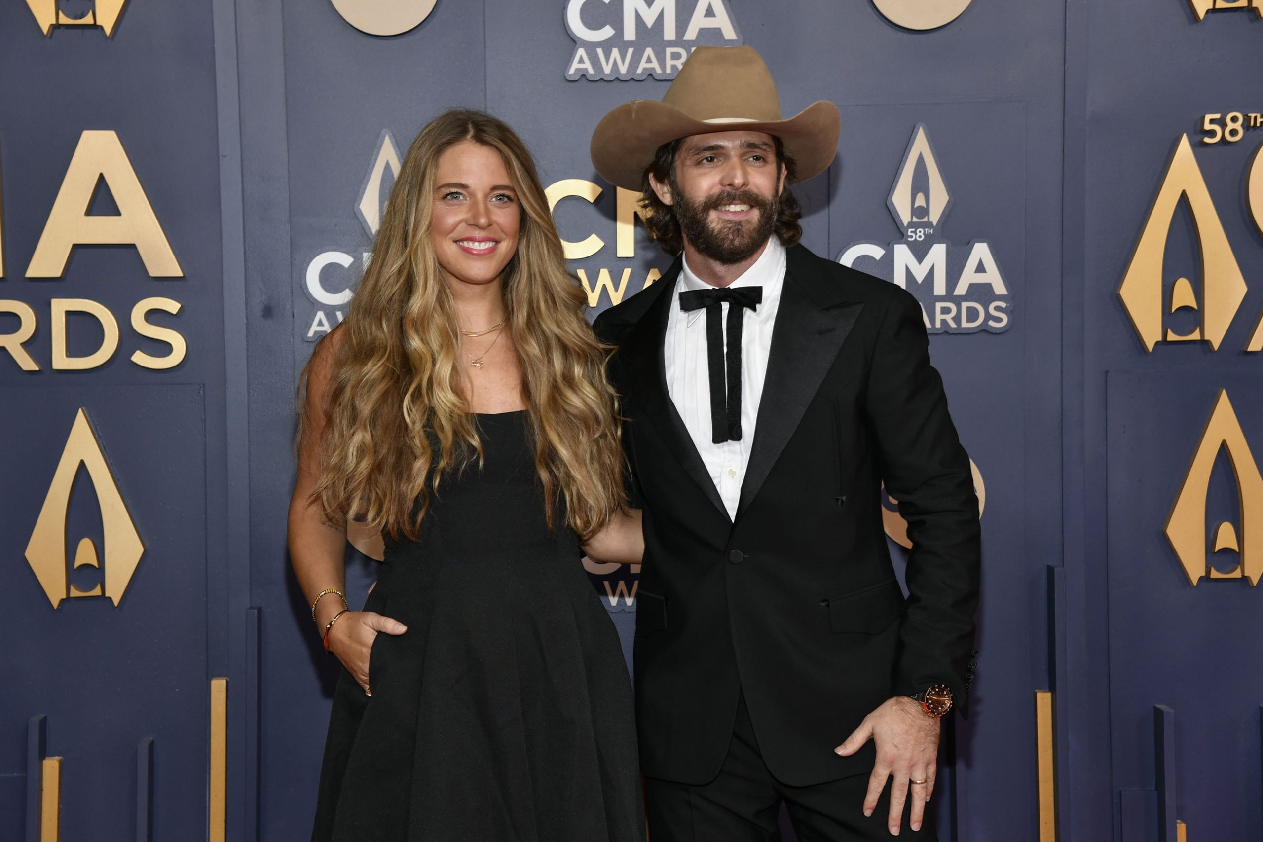 Lauren Akins, left, and Thomas Rhett arrive at the 58th Annual CMA Awards on Wednesday, Nov. 20, 2024, at Bridgestone Arena in Nashville, Tenn. (Photo by Evan Agostini/Invision/AP)