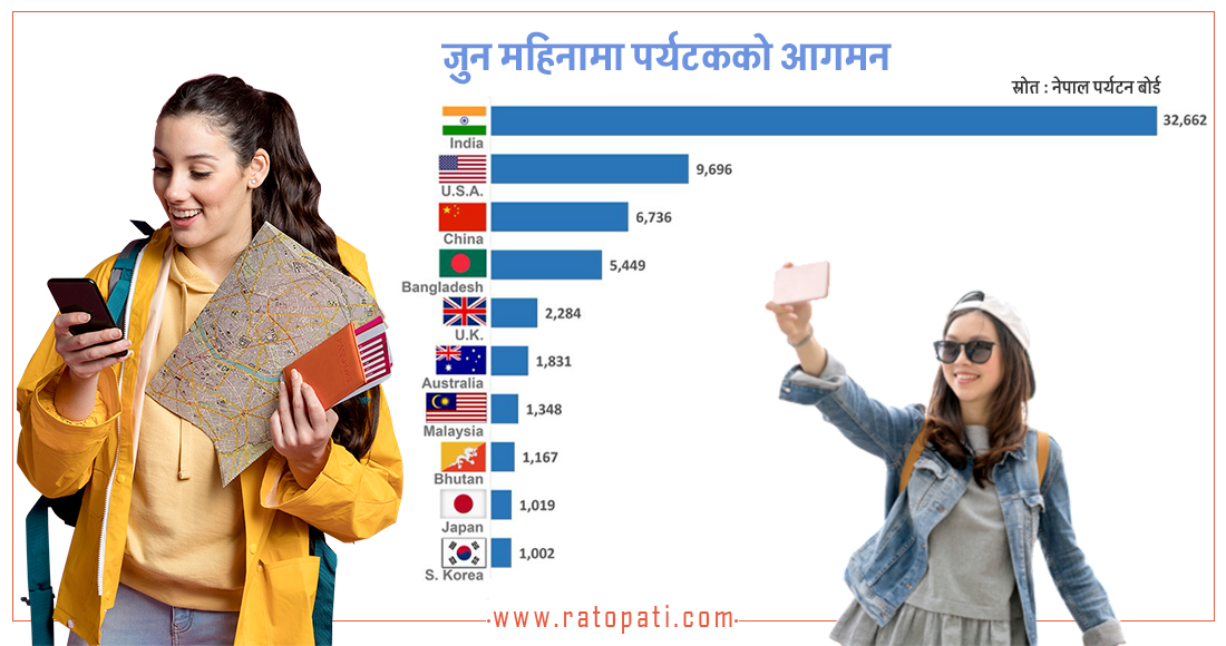 Kathmandu, 4 Jul: Among the tourists entering Nepal, the highest number are from India, followed by the United States. Moreover, recent data shows that the number of tourists visiting Nepal has been increasing. This indicates that the tourism sector in Nepal has been gradually reviving in recent years. Government records also show that hotel businesses have become more active, and the income generated from tourism has been steadily increasing.
