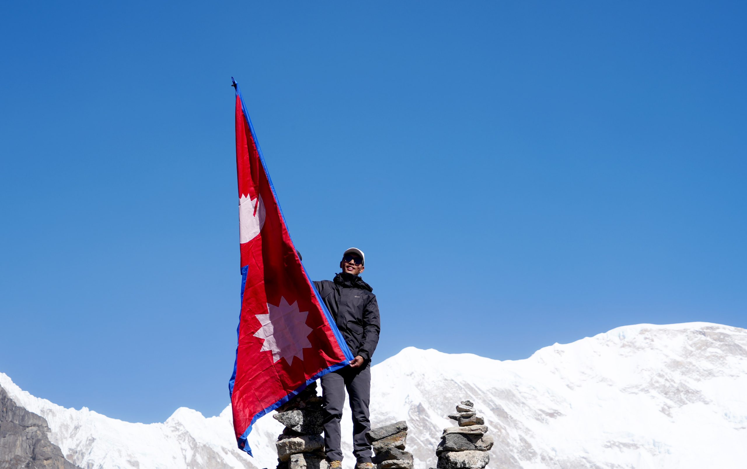 Gurung hoisting the flag at the Kanchenjunga base camp
