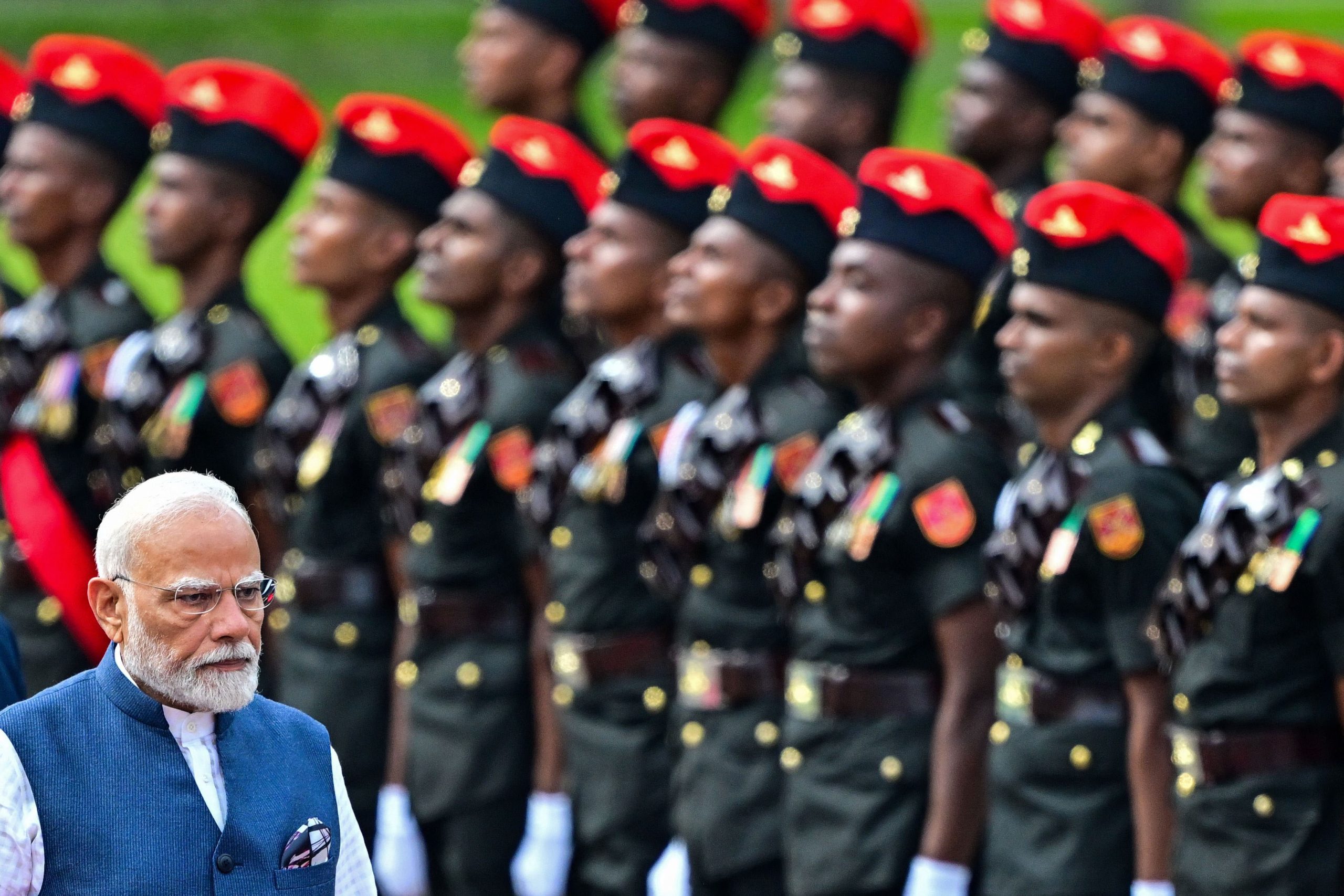 India’s Prime Minister Narendra Modi inspects a guard of honor during his ceremonial reception at the Independence Square in Colombo on April 5, 2025. (Photo by Ishara S. KODIKARA / AFP)