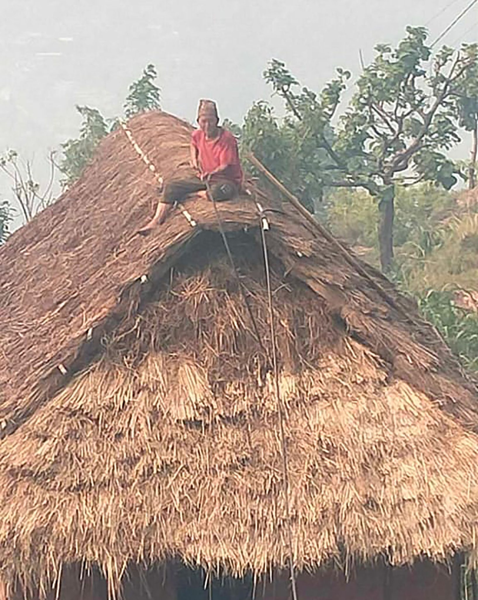 Shrestha had been working to extinguish the fire that had come close to his house by tearing down his neighbor’s roof, while other villagers had been working to extinguish the fire. Like him, other people who had gone to extinguish the fire were sitting on the roofs of thatched houses with water. Shrestha says that about 15 houses were saved by tearing down their roofs in this way.