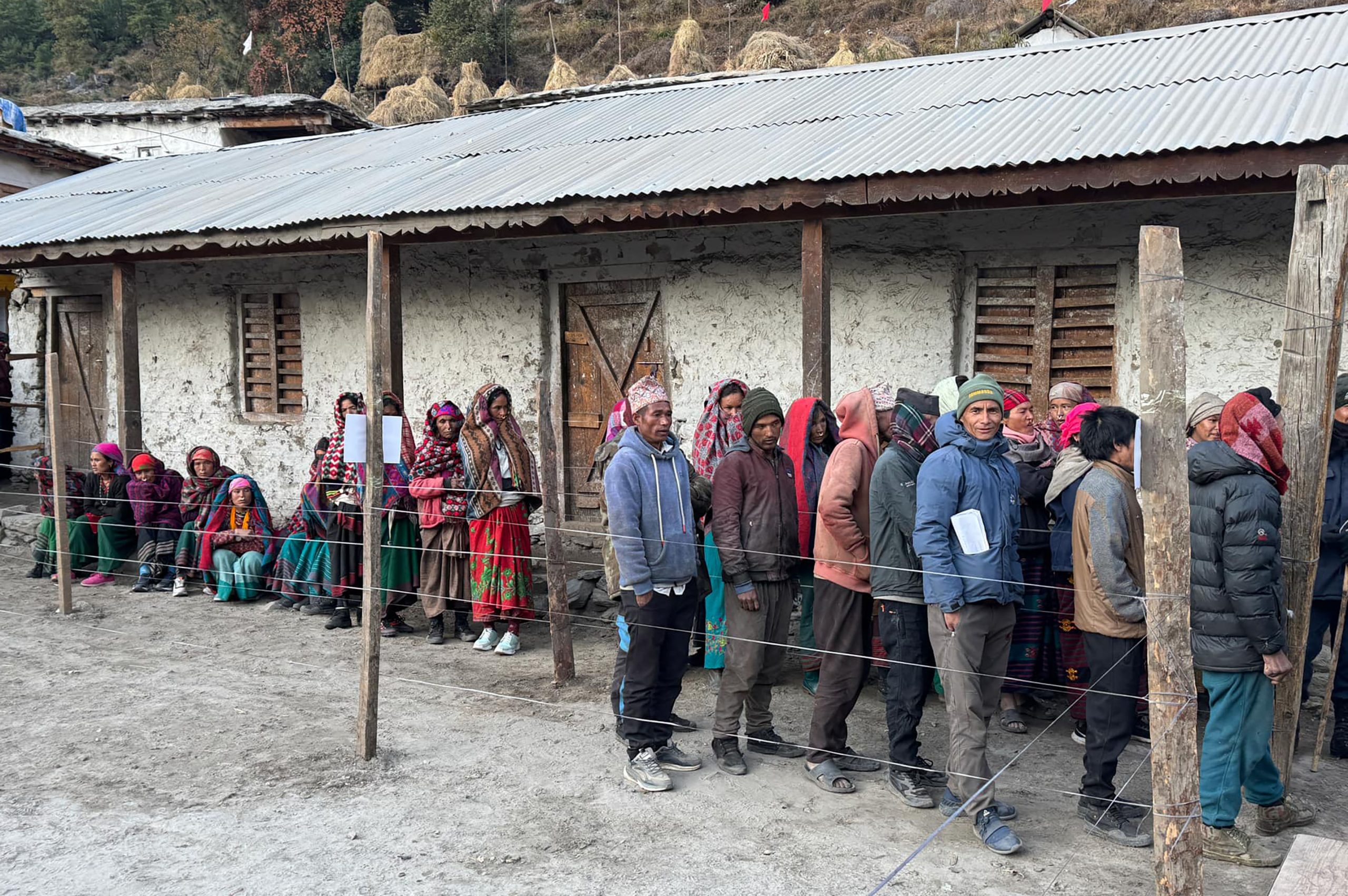 हुम्लाको सर्केगाड गाउँपालिकामा रिक्त पदका लागि भएको उपनिर्वाचनमा आइतबार सर्केगाड गाउँपालिका–३ स्थित देवकोटा आधारभूत विद्यालयमाको मतदान केन्द्रमा मतदानका लागि लामबद्ध मतदाता। तस्बिर : दाने बोहरा/रासस Voters queuing up to vote at the polling station at Devkota Basic School located in Sarkegad Rural Municipality-3 on Sunday in the by-election for vacancies in Sarkegad Rural Municipality of Humla. Photo: Dane Bohora/Rss