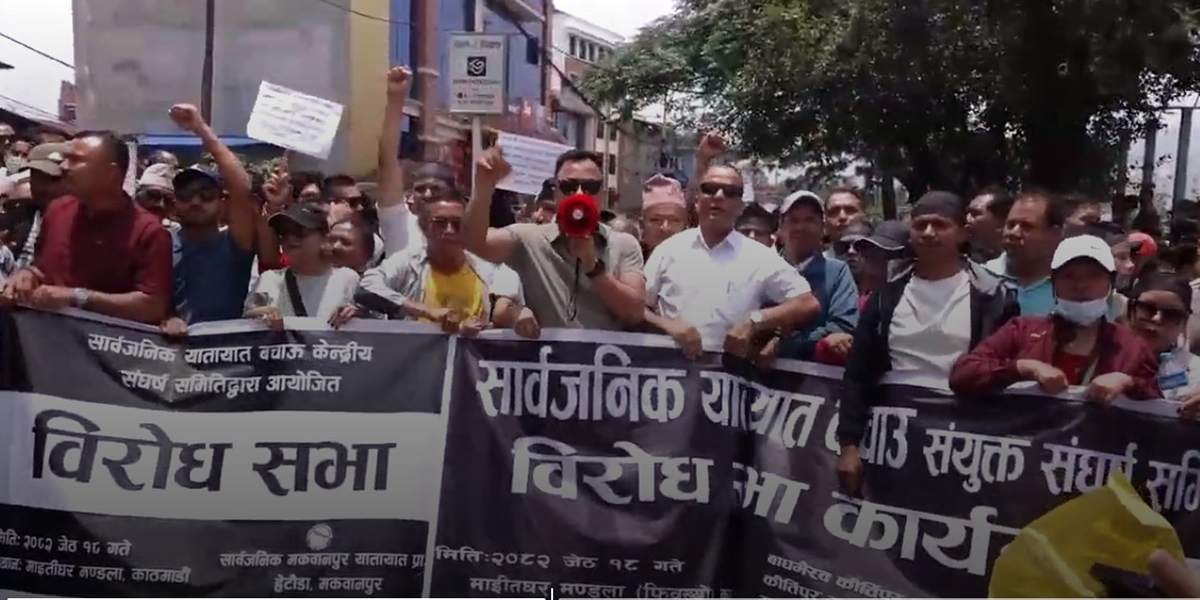 The Central Struggle Committee for the Protection of Public Transport organized a protest on Sunday, marching with black banners from Maitighar to Bijulibazar. They argue that the provincial governments are drafting regulations that contradict the Vehicle Act and conflict with the federal government’s authority by permitting private vehicles to carry passengers like public transport. The protest disrupted transportation across the Kathmandu Valley.