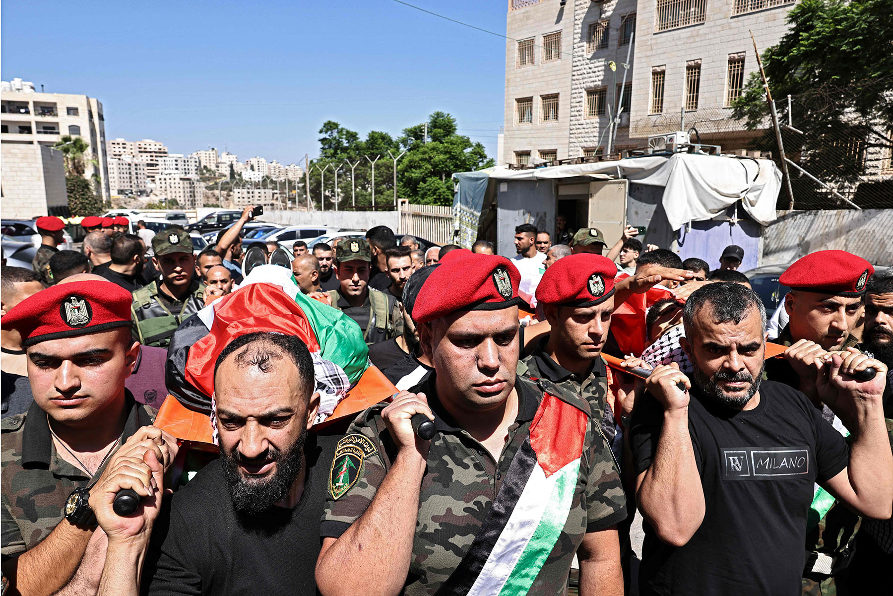 Armed Palestinian men look on during the funeral of Ahmad Shaikh Khaleel, who was killed during an Israeli airstrike on the Balata refugee camp east of Nablus that killed two Palestinians early morning on August 15, 2024. An Israeli air strike on a refugee camp in the occupied West Bank killed two Palestinians on August 15 as Jewish worshippers visited a nearby disputed holy site, Palestinian sources and Israeli army said. (Photo by Zain JAAFAR / AFP)Mourners carry the bodies of Ahmad Shaikh Khaleel and Wael Masha, who were killed during an Israeli airstrike on the Balata refugee camp east of Nablus that killed two Palestinians early morning on August 15, 2024, during their funeral. An Israeli air strike on a refugee camp in the occupied West Bank killed two Palestinians on August 15 as Jewish worshippers visited a nearby disputed holy site, Palestinian sources and Israeli army said. (Photo by Zain JAAFAR / AFP)